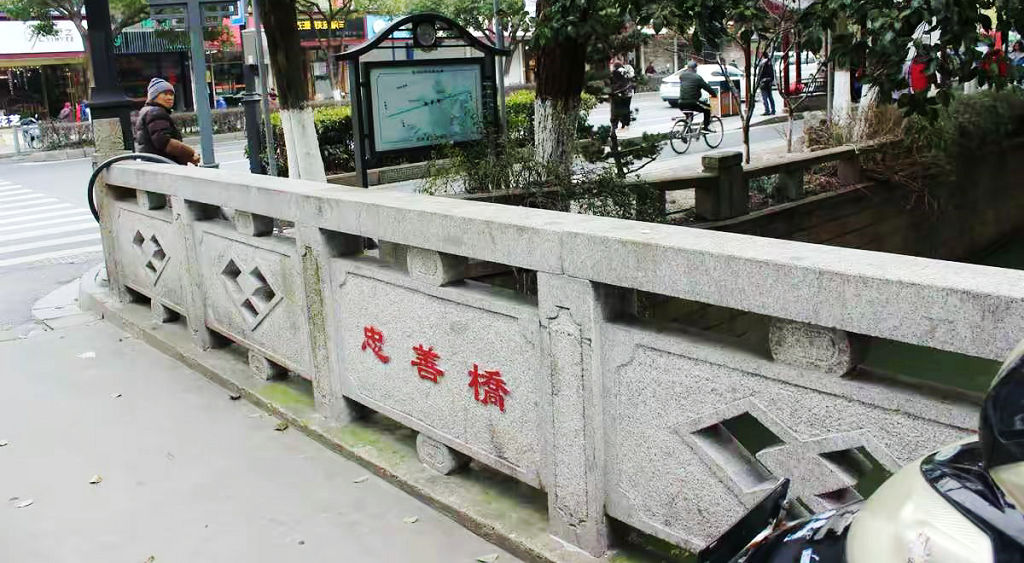 | 忠善桥 位于史家巷东口,俗称青石桥。宋《平江图》中名南新桥,南宋嘉定十四年(1221)重修。明代名曹胡徐桥。原曹胡徐巷旁有众善桥,清初河桥均废。清乾隆元年(1736)重修,名忠善桥。1978年苏州刺绣厂出资拓宽,可通卡车。1980年加固重修,为钢筋混凝土平桥。1999年9月重建,水泥桥面,花岗石栏杆。 | ||