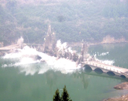 由于大桥桥墩和主拱部分全部由石料砌成,加之大桥主体部分全部被水淹没,无法实行水下爆破施工,为此施工方采用了水面爆破方式,共装填炸药160公斤。此次爆破只拆除了大桥的80米主拱,大桥两岸尚有71米引道,要在库区水位降至165米后再次爆破拆除。