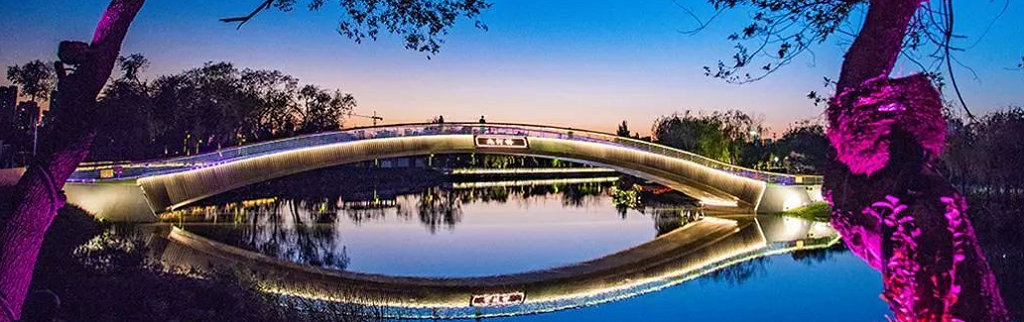 | 九河桥位于运河公园东南侧,连接运河公园和清池南大道。这座步行桥宽6.5米,设计净跨径为单跨50米、拱高5米。桥身采用封闭钢箱梁,外侧采用铝合金仿木装饰渐变形式,呈现新中式风格。 这座桥设计新颖,采用新型材料打造传统拱桥。拱桥外侧采用铝合金仿木装饰渐变形式,采用新中式风格。这座步行桥桥宽6.5米,桥身为钢结构箱型截面拱,设计净跨径为单跨50米、拱高5米。桥面为弧线型,并设置踏步。 早在这座桥之前,九河桥的位置上也有一座桥,是用木头做成的浮桥。 |