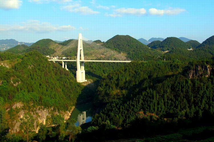 清江大桥位于湖北省恩施市舞阳坝街道办事处鸭子塘村,是沪蓉西高速公路西恩利段的控制性工程,也是沪蓉西高速公路西段最大的独塔斜拉桥,主塔高166.5米,主跨220米,边跨150米。