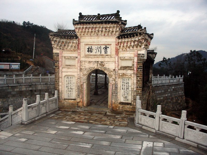 | 灵润桥亦称花桥,俗称过路亭。位于黄梅县四祖寺破额山出水口的石鱼矶上。元至正十年(1350年)由四祖寺住持祖意禅师募缘修建而成。该桥为单孔石桥,东西走向,宽约6米,长约20米,拱高3.2高,孔净跨7.35米,桥上建有廊屋5间,抬梁式构架,廊屋两端为砖砌八字牌楼门,墙壁绘有各种花鸟图案,桥下石矶上有唐宋以来历代文人墨客的题字石刻20余处,其中以唐代书法家柳公权书“碧玉流”石刻和唐宋八大家之一的柳宗元“破额山前碧玉流”诗刻最为珍贵。桥下泉水经石矶直泻深壑,构成“瀑布岭头悬,碧空垂白练”的壮观景象。为省级文物保护单位。 | ||