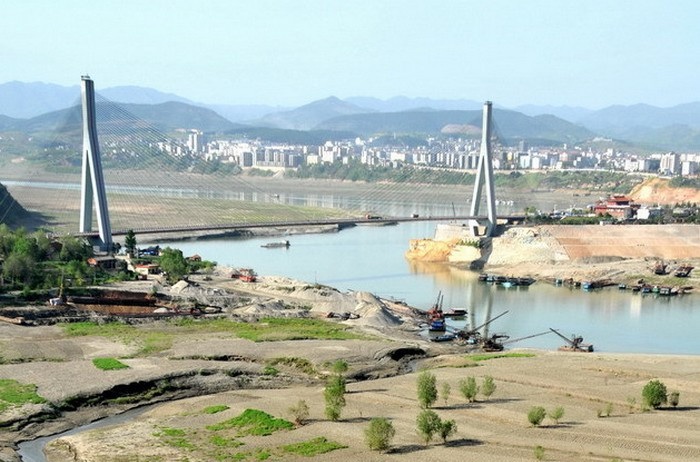 郧阳汉江桥位于湖北省郧阳县,跨越汉水,桥位在丹江口水库回水段。大桥为双塔、空间索面预应力混凝土斜拉桥。跨度配置86+414+86(m),全长601m。岸孔主梁43m,另配43m长地锚式平衡重锚固桥台。该桥主梁采用三向预应力三室单箱结构,全宽15.6m,中心高2.0m,主梁与平衡重锚固桥台刚结,与索塔分离。跨中设置可抗剪、抗弯、抗扭的无轴力接头。索塔采用钻石形钢筋混凝土空心结构,全高108.5m,桥面以上塔高90.62m,塔基为每座索塔用15根φ2.0m人工挖孔桩。每座索塔,河侧用25对斜拉索支承主梁,岸侧仅4对,另21对拉索锚固桥台上。拉索在梁、塔、台上的索距分别为8.0m、1.2m、2.0m。拉索在现场制作,采用PE热挤护套扭绞型钢丝索,两端配置冷铸锚具。平衡重锚固桥台采用三向预应力锚箱,每台锚箱16个箱室内填砾石与砂。该桥特点:1.背索主要锚于锚固桥台,提高了桥梁的总体刚度;2.采用空间索面,提高了梁的抗扭刚度;3.首次采用无轴力接头,增加了主梁的刚度和连续性;4.拉索集中于主塔上部单箱内,便于调整索力。该桥于1990年11月动工,预计1993年建成。湖北省交通规划院设计。四川省桥梁工程公司施工。