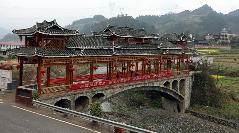 | [盘龙风雨桥] 又称美老风雨桥,位于凉伞镇美老村,廊桥长33米9间40柱,桥面宽5米,行车净空4米,于2014年4月动工兴建,11月完工,同年12月19日与美老鼓楼同时踩桥庆典。廊桥多层重檐结构,设三个苗式矩形桥亭。风雨桥由雷山县朗德木匠余国勇主墨建造,投资30万元,由美老村支两委向社会筹集建设资金,县文化部门协助,国家以奖代补工匠工资修建。桥两头有两幅对联:“美老寨中传美誉盘龙桥上对盘歌”、“烟雨一桥诗韵美,春风两岸画图新”赞云。 |
