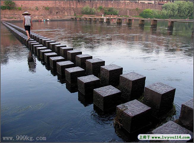 | 凤凰古城沱江跳岩,位于凤凰古城北门外沱江河道中。始建于清康熙四十三年(1704年),旧时是进出凤凰古城的主要通道之一。乾嘉苗民起义,辛亥革命凤凰光复起义、解放战争,这里都是进攻古城凤凰的主要通道。跳岩全长100米。共有15个岩墩,依次横列在沱江河床上。岩墩均用红砂块石修砌,墩与墩之间相距5米,上面用木板搭铺,木板再用铁链捆牢,固定在河两边的铁桩上,防洪水冲走。几度风雨霜雪,几度沧海桑田,跳岩仍坚固牢实,保存完好,如今不仅仍是两岸人民来往的要道,而且成为凤凰古城颇具民族特色的亮丽风景。 | ||
