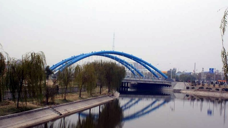 “丹阳路市政桥”--仿照西班牙巴塞罗那大桥,采用单跨双提篮钢管拱结构,桥长67.04米,宽43.8米。