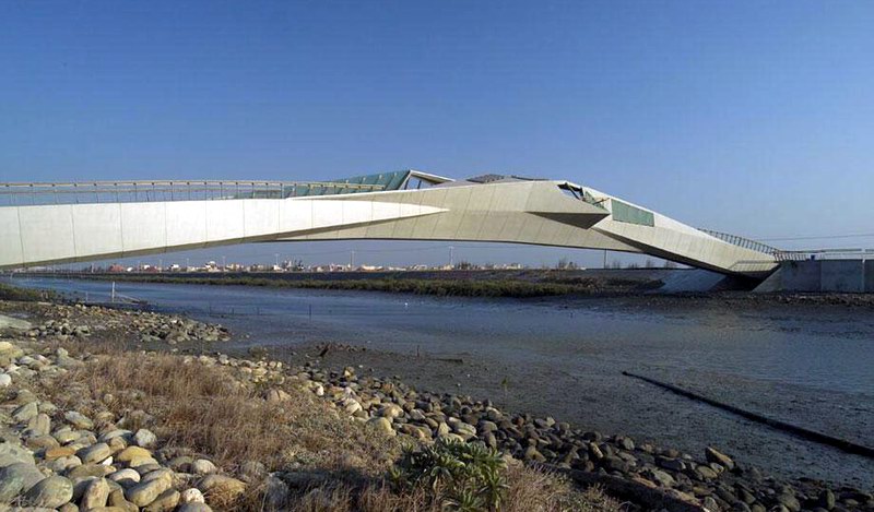 | 这是由AMBi Studio(廖伟立建筑事务所)设计的位于台湾彰化的王功生态景观桥项目,它靠近王功渔港,横跨Hoe-Gang河,连接港口和街区。与此同时这个桥体还充当一个观景,娱乐,生态教育的作用,同时也是当地的新地标项目。桥体采用钢铁构架和折叠式板面,形成一种智能化的身躯,好似两岸边的一个雕塑。主要结构利用钢铁拱形构架承重,石棉水泥板则用于表面覆盖。鉴于周围环境的强风及太阳照射等原因,设计除了定义雕塑般的形体外,还延展形成不同的遮挡结构,抗风挡雨,很好满足人们观景的需求。玻璃的使用也起到了遮挡的效果,地板则覆盖防霉防盐的木材,以营造出一种友好自然的氛围。同时桥体呈现出一种灰蓝色,以与周围环境融合,投射灯安置在堤坝上和桥下,以创造出动感的雕塑桥身和三维立体感。桥身上的折叠板根据人流线路进行变化,从而为人们形成座椅区,观景区,甚至是指引装置。 | ||