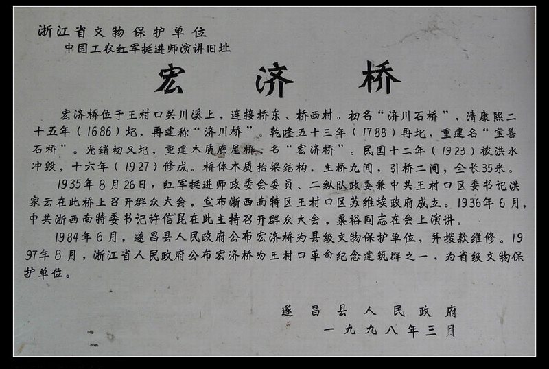 | 架于王村口桥东、桥西两村之间,是古时通衢(州)入闽要津。明代始建,初名济川石桥,后几经修建,清光绪初年改名宏济桥。为X脚架木梁廊屋桥。桥长31米,宽5.4米,高9米,4根桥梁,腾空过江,下由合抱粗的2根苦槠木交叉承托桥梁,梁上以硬木板铺面,桥上覆以瓦屋9间,每间左右两面均开桥窗。民国24年(1935)8月26日,中国工农红军挺进师二纵队政委、浙西南特委委员洪家云在桥上宣布王村口苏维埃政府成立。1936年6月,中共浙西南特委书记许信焜在桥上主持召开群众大会,挺进师师长粟裕作抗日宣传演讲。 | ||