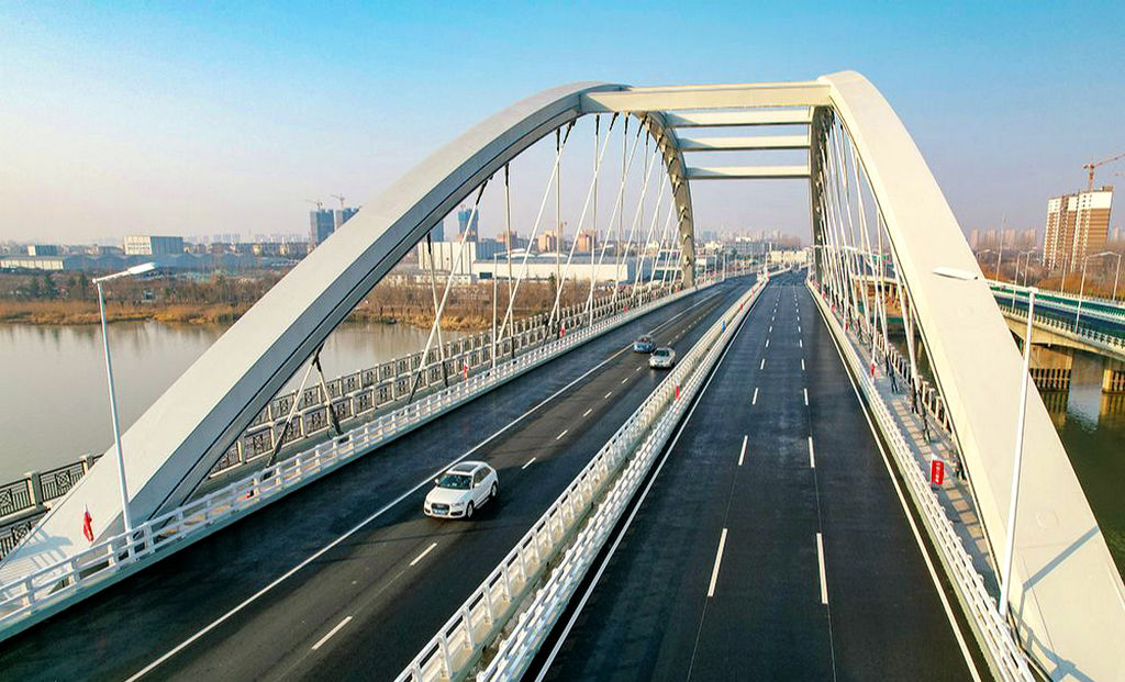 | 宿迁北京路快速化改造工程跨京杭大运河特大桥工程作为北京路快速化改造的关键节点,也是我市城建重点工程之一。该桥全长252.5米,为宿迁市首座下承式钢箱拱网状吊杆桥,全桥用钢量约7152吨,其中主梁总量为5250吨,拱肋总重为1902吨。 北京路跨京杭运河特大桥采用了三跨提篮式网状系杆钢拱桥结构,主梁标准段钢结构采用双边钢箱,钢梁标准段全宽37.45米,梁高2.5米。顶推梁段设有纵横坡、曲线段、变纵坡段等多种样式,顶推总长度达282米,同时桥梁建成后线型顺畅、层次丰富,配合大运河优美的风景,将成为宿迁城区一座新的地标式景观。 |