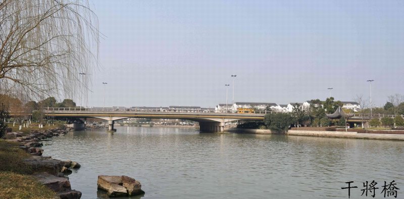 | 它是苏城开辟东西主要干道——干将路、连通苏州二翼“苏州工业园区和苏州高新区”而新建的桥(在路的西端,东端原来就有相门桥,我已在《桥》之二介绍过),桥面较宽,过河的跨度较长,双向六车道。 干将桥 位于干将西路,西堍为阊胥路,为改筑干将路的配套工程。1993年1月开工,1994年2月竣工,同年9月28日正式通车。 |