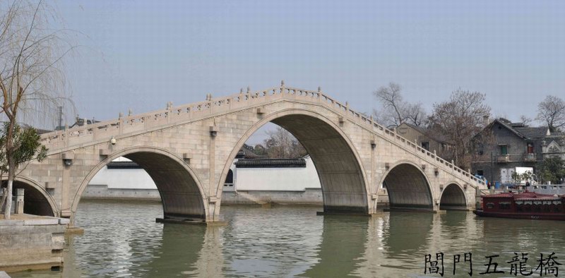 | 五龙桥 位于北码头与新建桥,取五龙汇水之意。有楹联四;南中联:长虹饮郭池景焕红尘风流地,五水朝阊阖烟笼碧落锦绣乡。边联:偃月五环留古韵,贤名千载誉香山。北中联:胜迹属阊闾风物宛然云亭画,贤名标史册黎元相忆白傅诗。边联:水势如军冲飞阁,关前有貔守白堤。 | ||