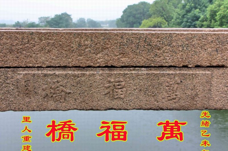 | 万福桥在八都镇陶家浜东,又名乌稍桥,建于清光绪二十一年(1895)。万福桥东西走向,梁式三孔,全长30.75米、中宽1.7米、高3.4米。中孔跨度5.35米。中孔两桥墩分别垒筑成长3米、宽2米、高3.4米的梯形桥墩,顶部横卧枕石各1块,均是长2.7米、宽0.5米、高0.3米。两边护栏用长6.75米、宽0.25米、高0.25米条石构筑。两边桥坡踏步均是整块条石铺级,东西各6级,现覆盖预制板。全桥主要构件为花岗石,部分青石。桥西北侧原建一座方亭,亭柱上刻着楹联“日月高庚入乾坤,风雨雅乃平安地”,落款“民国三十三年建”。近年,在古桥旁建起一座新桥,方亭被拆除。1994年,万福桥列为吴江市文物控制单位。2014年,升级为苏州市文物保护单位。 | ||