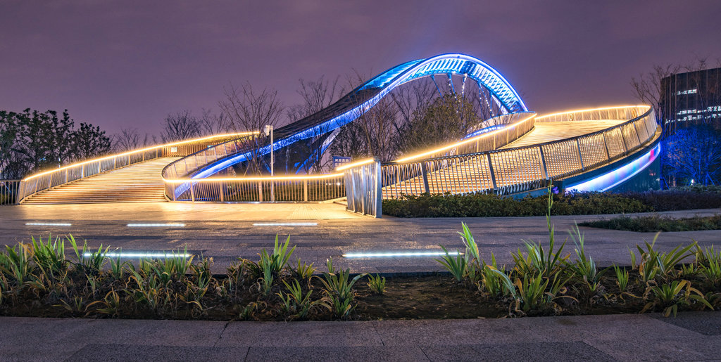 | 澹台湖景观桥桥位于京杭大运河吴中段,澹台湖大桥东侧200米左右,为异形钢结构拱桥,桥长174米、宽6米,单跨110米。 一座气贯长虹的高颜值景观桥,灯光是根据四季设计的,整体造型非常有冲击力,像一个阿拉伯数字8。 玉波桥位于京杭大运河吴中段东部的宝带桥·澹台湖景区,是异形格构式钢结构拱桥,桥长174米、宽6米,单跨110米,桥面与桥体主拱绵延连续,形成“8”字形的整体结构。桥面拱的矢高为9.5米,悬挂拱的矢高为25米,8字造型给人以蜿蜒之感,远看又似一彩虹玉带漂浮于水面之上,寓意“运河涟漪,碧波飘带”。 玉波桥于2016年10月12日动工,2017年10月完成桥梁主体工程,具备行人通行条件。2017年11月完成景观铺装、绿化,竣工验收。2018年1月正式启用。 |