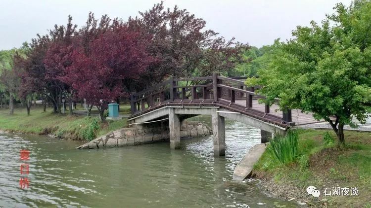 夏日桥座落在石湖景区,吴堤东侧面的野营岛内的三孔平桥,桥座落南北向,桥底三孔小湖泊水连通石湖水。
