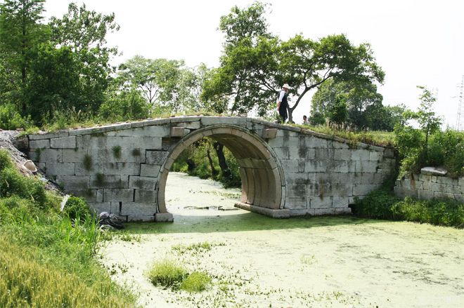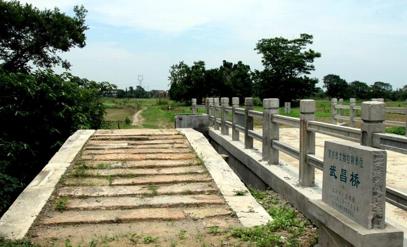 | 武昌桥,位于宜兴市周铁镇彭干村宋庄自然村。2009年5月,宜兴市人民政府将其公布为市级文物保护单位。 武昌桥建于清代,石拱桥,俗称王公桥,南北向,花岗石、青石混砌,其中桥面为花岗石、桥身为青石。桥面长1.50米,宽2.90米。桥板长1.50米,宽0.42米,厚0.20米。北坡长5.35米,坡度9°,台阶8级,下堍宽3米。南坡长4.90米,坡度9°,台阶11级,下堍宽2.85米,趟石宽0.40米。北侧枕石长3.45米,宽0.30米,厚0.30米。枕石内间距2.65米,外间距3.35米。净跨3米,矢高2.60米,桥底面到水面高度2.90米。券石厚0.28米,花券厚0.10米。桥铭:武昌桥。桥铭石长1.50米,宽0.42米,厚0.20米。 |