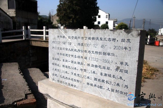 | 升平桥,位于宜兴市丁蜀镇兰右村。2009年5月,宜兴市人民政府将其公布为市级文物保护单位。 升平桥建于明嘉靖年间(1522~1566),单孔石梁桥,东南-西北走向,花岗石、青石混砌。桥通长14米,中宽2.10米。净跨6米,桥底面到水面高度3.20米。东南坡长5米,堍宽3.65米,坡度16°,台阶14级。西北坡长3.20米(现已改为水泥台阶)。枕石长2.70米,高0.35米,厚0.36米。桥桩立柱共4根,长2.27米,宽0.66米,厚0.26米。上面刻有对联,字迹已无法辨识。桥边有河埠。 |