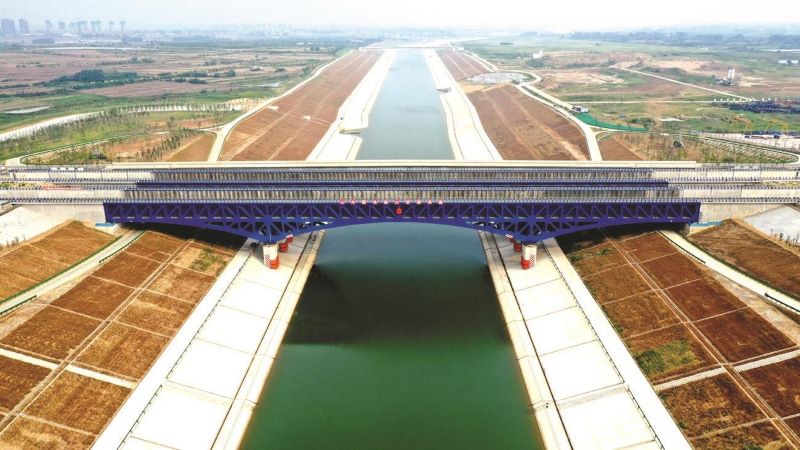 淠河总干渠渡槽位于江淮分水岭北侧,为解决高差36米的两大水系人工河流的通水、通航等问题而新建。