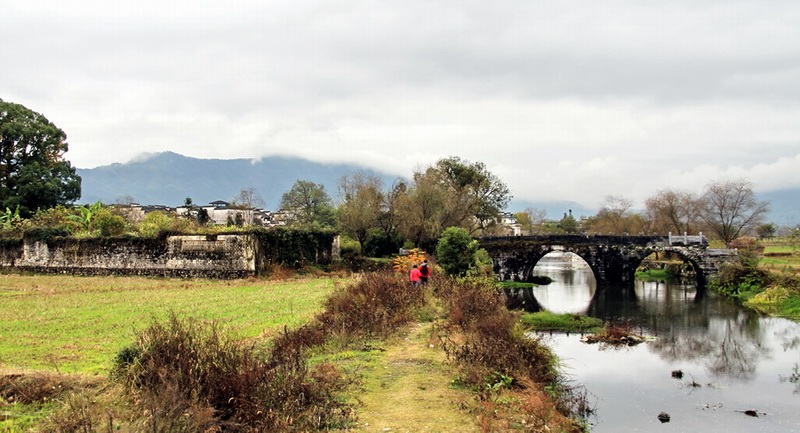 万松桥。位于黟县南屏村村口。围绕着南屏村东西两侧的小溪涧最后汇入了村北叫做武陵溪的大河中。沿着村口枫树林的小道往北走不多远,就是横亘的武陵溪,河上架着一座三孔的石拱桥,就是万松桥,桥整体用黟县青石砌成的,桥面跟所有的徽州古桥一样非常地宽大,显得非常有气势。站在东边新修的公路桥上回头望南屏,这应该是南屏经典的镜头。记得电影菊豆开篇李保田牵着马进村的镜头,走的桥头就是万松桥,背景是层叠的马头墙构成的南屏村,连接桥是一处老墙围成的空地,这里早先应该是村庙之类的建筑,在往南就是万松林,在这一条线之后就是南屏村,再后面是高高的南屏山。万松桥边有万松桥记碑一块,应该不是旧物,桥记是清代散文大家姚鼐手笔,碑文比收录在《惜抱轩全集》中文字略少,现把原文辑录如下:“徽州之县六,其民皆依山谷为村舍。山谷之水湍悍易盛衰,为行者患,故贵得石桥为固以济民。吾至徽州,观其石梁之制坚整异于他郡,盖由为之者多,石工习而善于其事故也。
