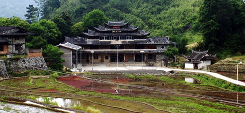 德化县水口镇淳湖村湖山桥从正面看几乎找不到桥洞在哪里,实际在楼阁基座平台的下方有一个3米宽的拱洞用来过水。这座桥(当地人确实叫它“桥”)原建于宋代,其上的五层楼阁1940年代被焚毁,近代重建,里面供奉泰山尊王。