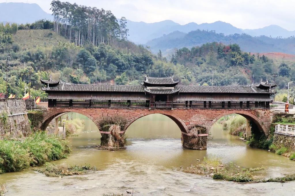 | 会清桥位于福建省永安市贡川镇集风村,在胡贡溪交汇处。 始建年代不详,据《八闽通志》卷十九“地理、桥梁”延平府永安县载,“会清桥,在二十六都”,二十六都即贡川。《八闽通志》始修于明成化乙已年(1485年)。因此可以认定,会清桥距今有500多年的历史。 会清桥南北向,两墩三孔,横跨胡贡溪之上,连接贡川堡与巫峡头,桥长41米,宽7米,桥面高8.1米,桥身用丹霞石砌成拱券型。桥上建木屋,形成长廊式走道。桥屋11间,56根木柱,桥两端有门楼,中部是升起的桥亭。门楼四面坡屋顶,正脊上有鱼吻,屋檐下有如意斗拱、彩绘、泥塑。桥亭是单檐歇山屋顶,下方有方型藻井神龛,内奉“真武大帝”。桥身是悬山屋顶。会清桥屋采取五架抬梁式,斗拱形式多样。 古城墙·会清桥于1984年被永安市人民政府公布为第一批市级文物保护单位。2001年被福建省人民政府公布为第五批省级文物保护单位。 |