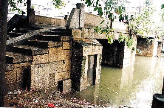 据笔者现场考察,在桥体发现了两块至今方志还未记载的较完整的石碑,其中有存史价值的一块是清代光绪二十九年六月由青石勒制的《禁占官涌碑记》。由于年代久远,雨风侵蚀,有的字已模糊难认,但仔细辨读,亦可知其略,大意是:近来有的杉店在岸边竖桩,停泊杉排和寿板,非法占用官涌官地,影响来往交通和居民生活,现已禀明官府,立碑查禁,今后在官涌官地“不准竖桩”,杉排寿板“随到随起”,违者“当众责罚不贷”,并作无主货物处理;如有阻止执行者,即禀官查究。从上述碑文可知,汇津桥附近一带,清中叶以后,商业就较为发达,木材商店林立,是杉木及其制品的集散地。杉排由后航道可直接浮运直达汇津桥,可见当时马涌的涌面之宽、水之深。该桥中间桥孔的净跨达5.7米,大可通80吨以下的货船。
