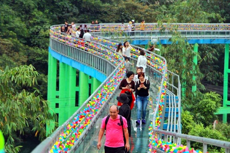 玻璃桥依河而建,全长1008米,蜿蜒起伏,沿途布满80000只五颜六色的风车及无数鲜花,宛如七彩巨龙盘踞在翠绿的群峰翠竹之上,仿佛置身于童话世界里。是目前华南地区最长的人行玻璃桥。