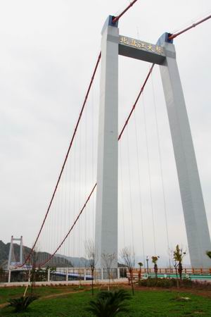 | 飞越贵州北盘江大峡谷、距水面高405米(是目前世界最高的桥梁)的北盘江大桥近日建成通车。该桥主跨388米,是我国首座采用双向预应力砼加劲板梁设计的特大型桥梁。它连接关岭至兴义的高等级公路,是贵州“二横二纵四联线”高等级公路网中的一条重要联线。贵州的交通基础设施建设近年来取得突破性进展,目前,全省已有高等级公路3200多公里,等级公路近3·5万公里,今年又将有近700公里的高等级公路陆续通车。昔日“贵州地无三尺平”的说法已成遥远的过去。 关兴公路北盘江大桥位于贵州省贞丰县与关岭县交界的北盘江上,横跨北盘江。该桥是一座斜拉式高架公路桥,是贵州省关(岭)兴(义)高等级公路上的咽喉,是同类桥中的中国第一、亚洲第二。是我国首座采用双向预应力砼加劲板梁设计的特大型桥梁。它连接关岭至兴义的高等级公路,是贵州“二横二纵四联线”高等级公路网中的一条重要联线。该桥长度388米,距离水面486米,于2003年12月28日建成并通车,为中国第一高桥。 |
