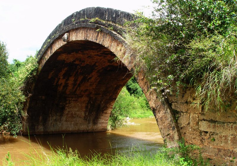 | 石鳌桥,位于沙溪南端坝尾,江尾村南面龙骨山和蛇山之间的黑漶江上,距寺登街约6000米。单拱半圆型,桥长266米,宽5.6米,建于民国初年,俗称“关风桥”,意在关住南来的风。它是旧时南下乔后盐井的必经之桥,因其处在古镇南来风头上,当地人一直把它称为“关风桥”,意为“关住风的桥”。现在石鳌桥约三十米处新建一座公路桥,石鳌桥也就退出古道路上桥梁的作用,只以风水桥的作用悄然屹立在黑潓江上。——(参考文献:《沙溪寺登街》) 从寺登街往南顺着平甸公路5-6公里,过溪南村就可以看到石桥,石桥保持着古时的面貌。沙溪新桥修之前石鳌桥是沙溪往南去乔后盐矿的必经之路,沙溪新桥修好之后,只有少许人从此桥走。桥上、桥边长满了杂草,桥上的石头也已变得发黑,而这一切掩盖不了石鳌桥曾经的辉煌。 |
