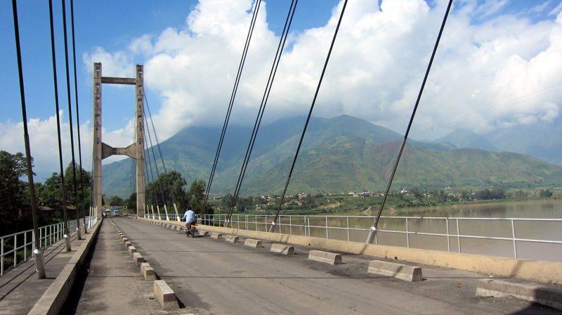 | 永胜金江大桥 位于永胜南境,原金江吊桥西侧。线路桩号为祥宁线改建二级路后的k96+719m,为斜拉桥,全长219.80米,3跨组合,主跨106米。于1998年5月建成通车。 因下游金沙江鲁地拉水电站建成蓄水,金江大桥属于淹没区。 |